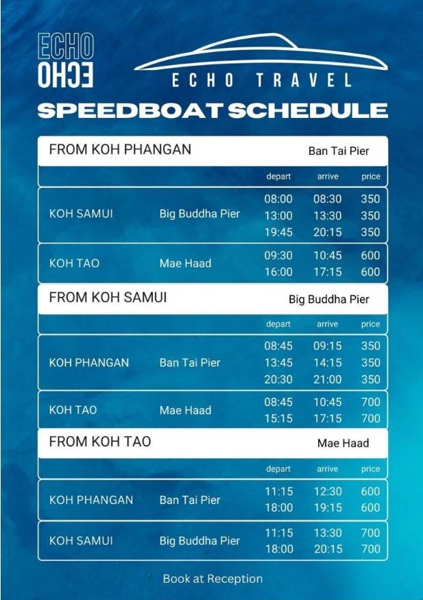 Route: From Koh Samui Airport, take a taxi to Petcherat Marina. Board the Echo Travel Speedboat (see schedule below) which will drop you off at Baan Tai Pier. From Baan Tai Pier, take a taxi to Haad Rin Beach, then proceed to The Sanctuary Haad Tien.